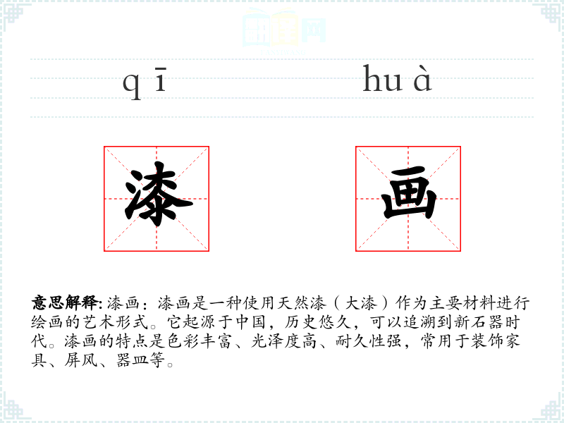 - 反义词:水彩画、油画(这些是使用不同媒介的绘画形式,与漆画形成对比)