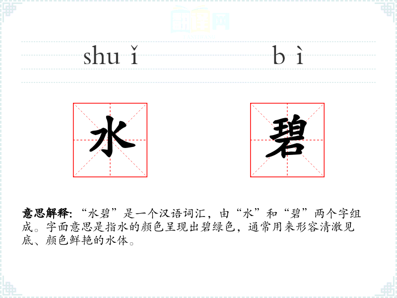 “水碧”是一个汉语词汇,由“水”和“碧”两个字组成。字面意思是指水的颜色呈现出碧绿色,通常用来形容清澈见底、颜色鲜艳的水体。
