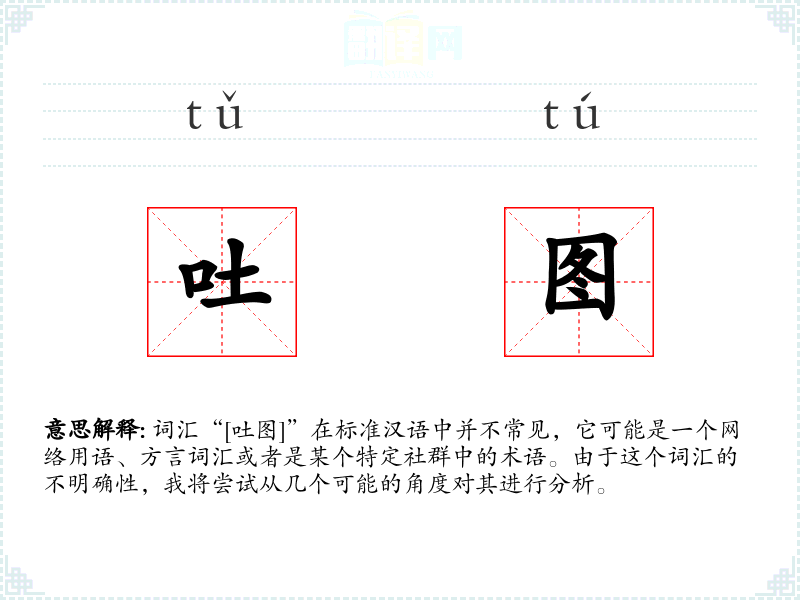 “[吐图]”这个词汇的不确定性使得对其进行深入分析变得困难。在没有更多上下文信息的情况下,我们只能基于字面意思进行猜测。在语言学习和表达中,了解和掌握标准词汇是非常重要的,而网络用语和特定社群的术语则需要在特定的语境中学习和理解。