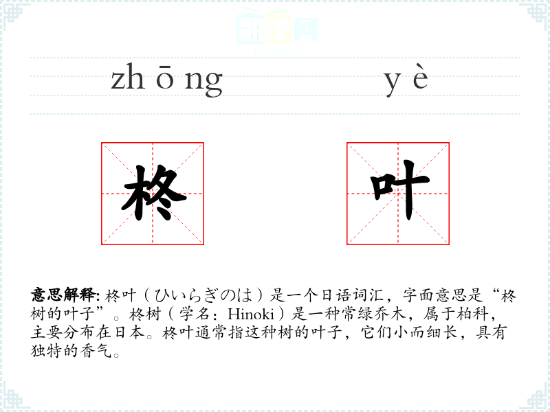柊叶(ひいらぎのは)是一个日语词汇,字面意思是“柊树的叶子”。柊树(学名:Hinoki)是一种常绿乔木,属于柏科,主要分布在日本。柊叶通常指这种树的叶子,它们小而细长,具有独特的香气。