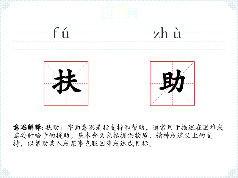 扶助:字面意思是指支持和帮助,通常用于描述在困难或需要时给予的援助。基本含义包括提供物质、精神或道义上的支持,以帮助某人或某事克服困难或达成目标。