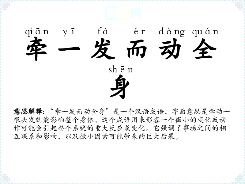 “牵一发而动全身”是一个汉语成语,字面意思是牵动一根头发就能影响整个身体。这个成语用来形容一个微小的变化或动作可能会引起整个系统的重大反应或变化。它强调了事物之间的相互联系和影响,以及微小因素可能带来的巨大后果。