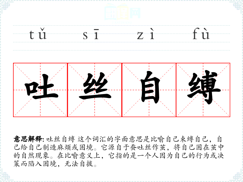 吐丝自缚 这个词汇的字面意思是比喻自己束缚自己,自己给自己制造麻烦或困境。它源自于蚕吐丝作茧,将自己困在茧中的自然现象。在比喻意义上,它指的是一个人因为自己的行为或决策而陷入困境,无法自拔。