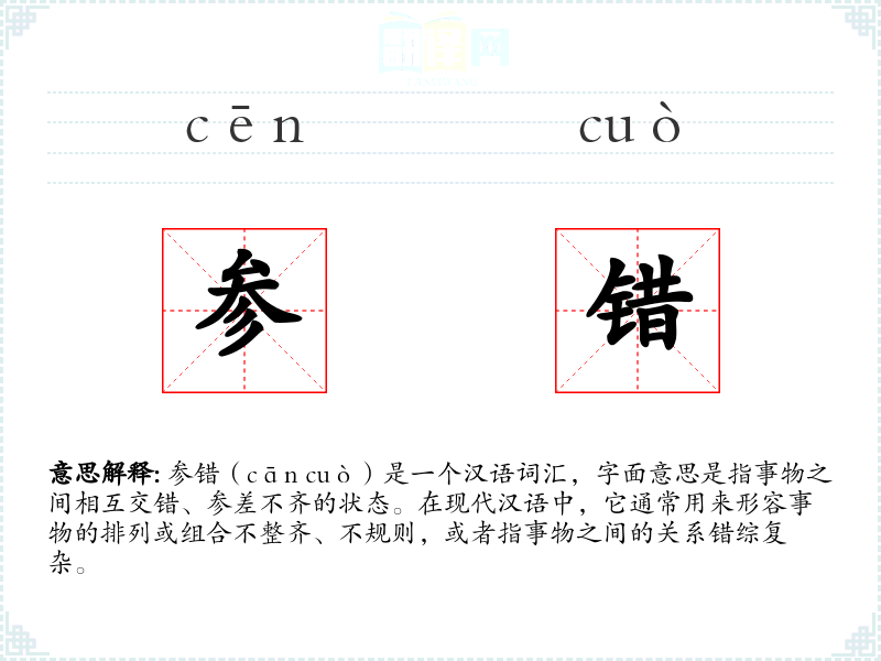 参错(cān cuò)是一个汉语词汇,字面意思是指事物之间相互交错、参差不齐的状态。在现代汉语中,它通常用来形容事物的排列或组合不整齐、不规则,或者指事物之间的关系错综复杂。