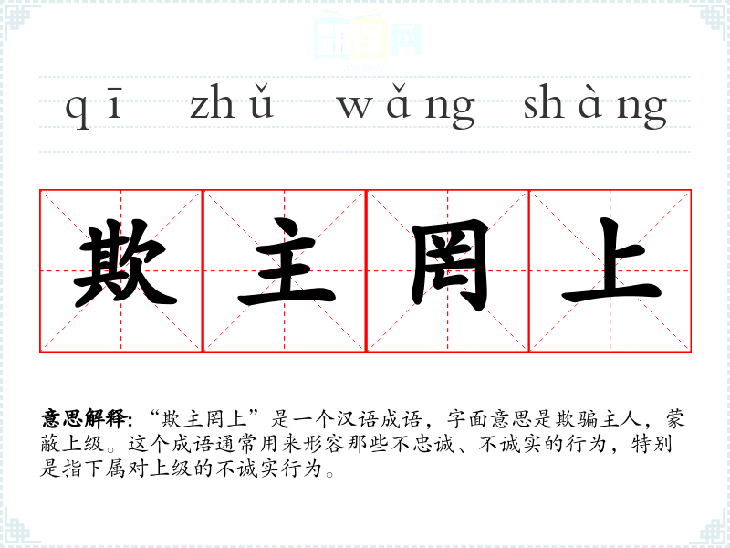“欺主罔上”是一个汉语成语,字面意思是欺骗主人,蒙蔽上级。这个成语通常用来形容那些不忠诚、不诚实的行为,特别是指下属对上级的不诚实行为。