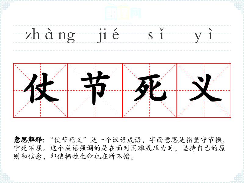 “仗节死义”是一个汉语成语,字面意思是指坚守节操,宁死不屈。这个成语强调的是在面对困难或压力时,坚持自己的原则和信念,即使牺牲生命也在所不惜。