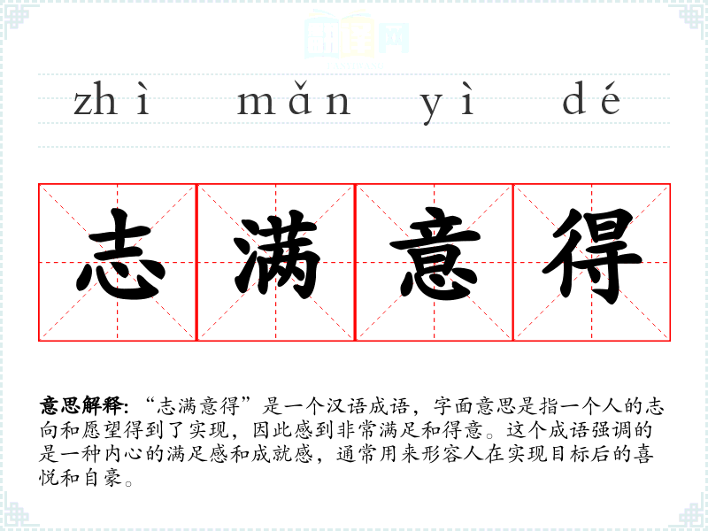“志满意得”是一个汉语成语,字面意思是指一个人的志向和愿望得到了实现,因此感到非常满足和得意。这个成语强调的是一种内心的满足感和成就感,通常用来形容人在实现目标后的喜悦和自豪。