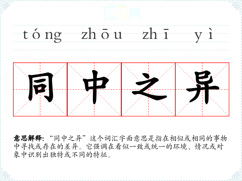 “同中之异”这个词汇在中文中是一个成语,源自对事物细致观察的传统。它强调在普遍性中发现特殊性,反映了中华文化中对细节和差异的重视。