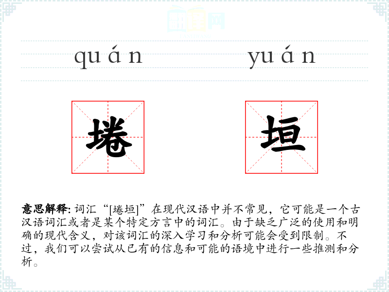 由于“埢垣”不是一个常见的现代汉语词汇,它在不同语境下的使用可能非常有限。在古代文献或特定的方言中,它可能用来描述某种建筑结构或地理特征。