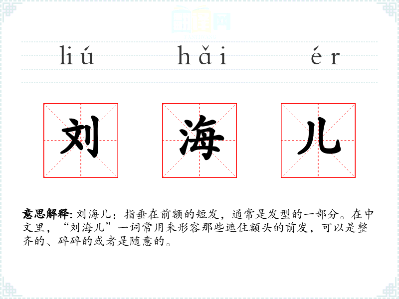 刘海儿:指垂在前额的短发,通常是发型的一部分。在中文里,“刘海儿”一词常用来形容那些遮住额头的前发,可以是整齐的、碎碎的或者是随意的。