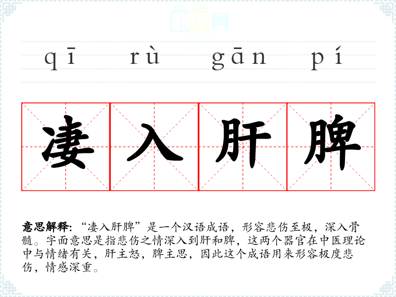 “凄入肝脾”是一个汉语成语,形容悲伤至极,深入骨髓。字面意思是指悲伤之情深入到肝和脾,这两个器官在中医理论中与情绪有关,肝主怒,脾主思,因此这个成语用来形容极度悲伤,情感深重。