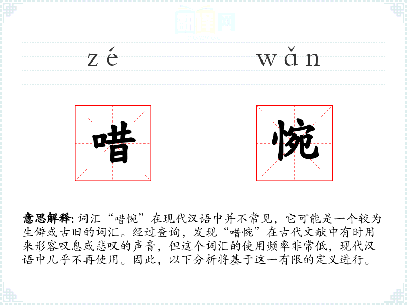 词汇“唶惋”在现代汉语中并不常见,它可能是一个较为生僻或古旧的词汇。经过查询,发现“唶惋”在古代文献中有时用来形容叹息或悲叹的声音,但这个词汇的使用频率非常低,现代汉语中几乎不再使用。因此,以下分析将基于这一有限的定义进行。