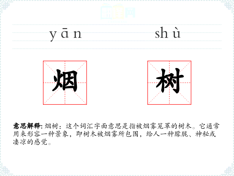 烟树:这个词汇字面意思是指被烟雾笼罩的树木。它通常用来形容一种景象,即树木被烟雾所包围,给人一种朦胧、神秘或凄凉的感觉。
