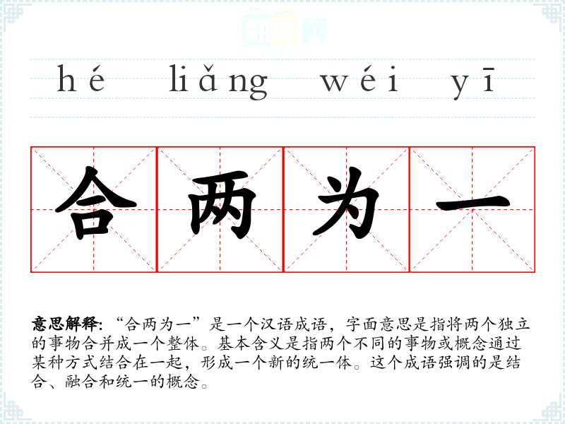 “合两为一”是一个汉语成语,字面意思是指将两个独立的事物合并成一个整体。基本含义是指两个不同的事物或概念通过某种方式结合在一起,形成一个新的统一体。这个成语强调的是结合、融合和统一的概念。