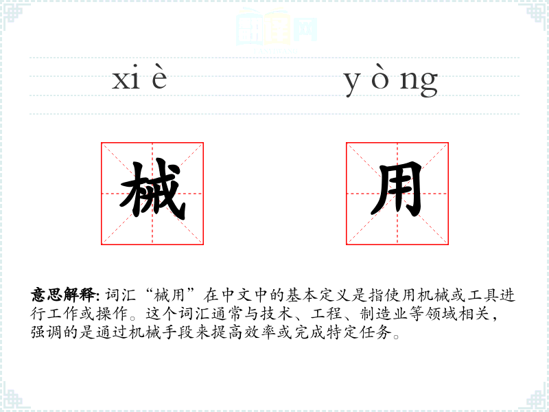 词汇“械用”在中文中的基本定义是指使用机械或工具进行工作或操作。这个词汇通常与技术、工程、制造业等领域相关,强调的是通过机械手段来提高效率或完成特定任务。