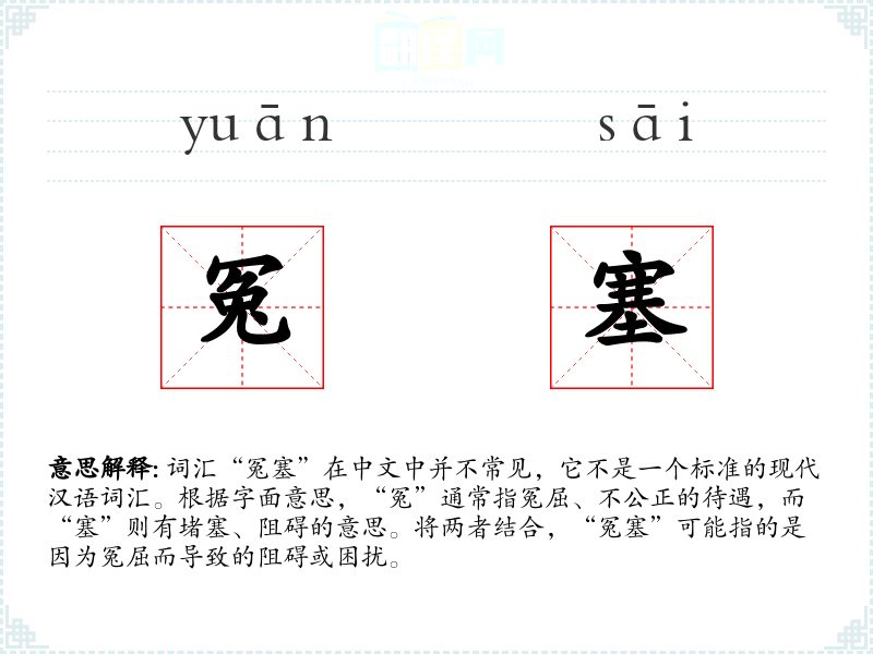由于“冤塞”不是一个常用词汇,其词源和历史演变难以考证。它可能是由“冤”和“塞”两个字组合而成的新词,用以表达特定的情感状态。