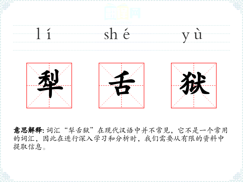 “犁舌狱”字面意思是指一种类似于地狱的惩罚场所,其中“犁舌”可能指的是一种残酷的刑罚,即用犁或其他工具割裂舌头。这个词汇可能源自古代对刑罚的描述,但在现代汉语中并不常见。