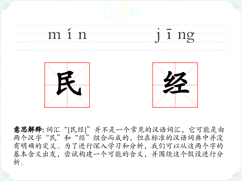 词汇“[民经]”并不是一个常见的汉语词汇,它可能是由两个汉字“民”和“经”组合而成的,但在标准的汉语词典中并没有明确的定义。为了进行深入学习和分析,我们可以从这两个字的基本含义出发,尝试构建一个可能的含义,并围绕这个假设进行分析。