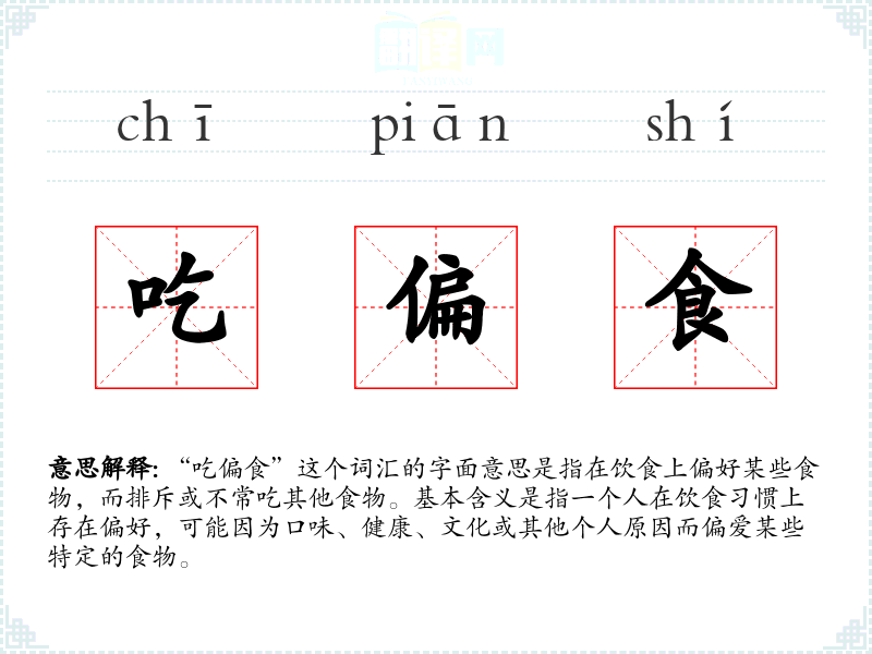 - 口语语境:在日常对话中,这个词汇通常用来描述某人的饮食习惯,例如“他吃偏食,不喜欢吃蔬菜”。