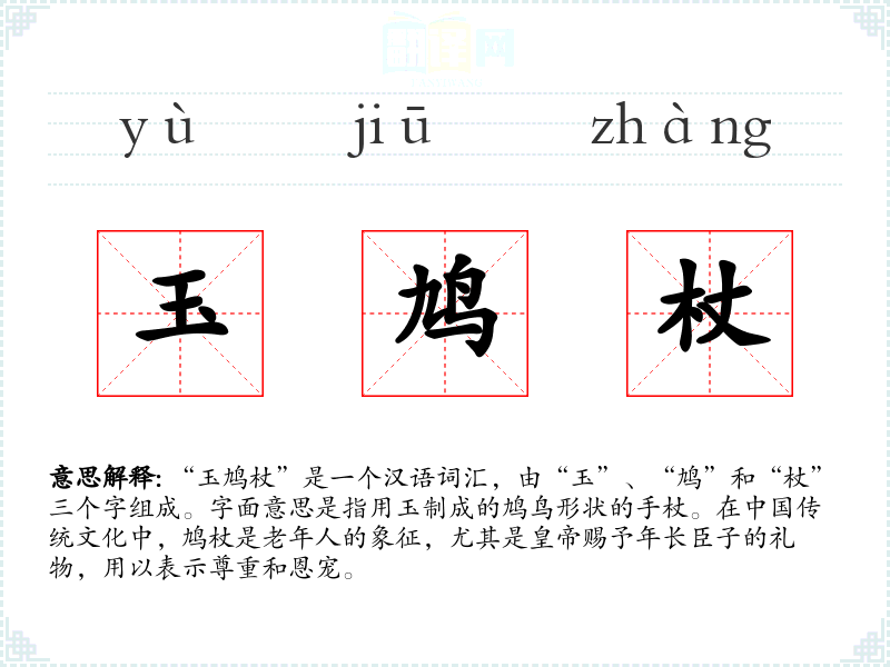 “玉鸠杖”是一个汉语词汇,由“玉”、“鸠”和“杖”三个字组成。字面意思是指用玉制成的鸠鸟形状的手杖。在传统文化中,鸠杖是老年人的象征,尤其是赐予年长臣子的礼物,用以表示尊重和恩宠。