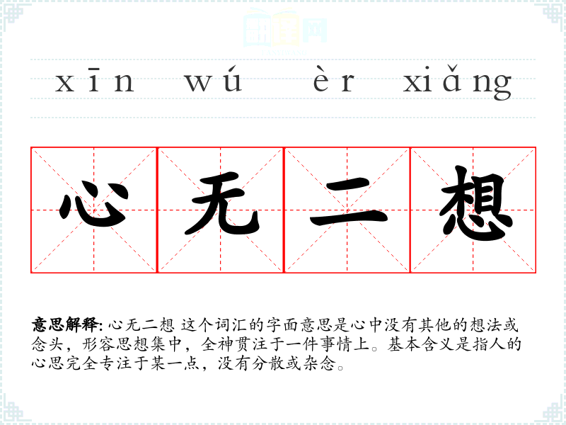 心无二想 这个词汇的字面意思是心中没有其他的想法或念头,形容思想集中,全神贯注于一件事情上。基本含义是指人的心思完全专注于某一点,没有分散或杂念。