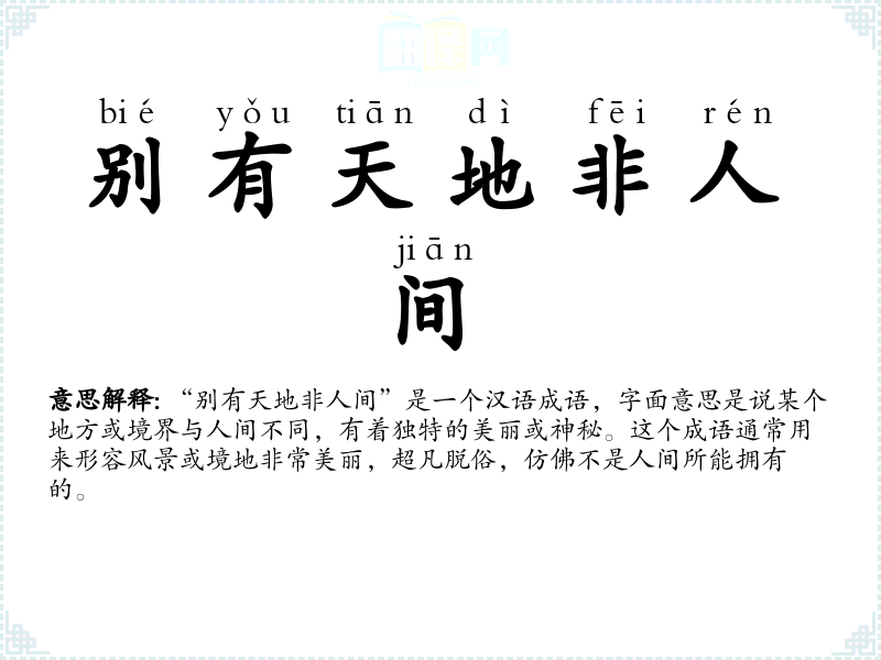 “别有天地非人间”是一个汉语成语,字面意思是说某个地方或境界与人间不同,有着独特的美丽或神秘。这个成语通常用来形容风景或境地非常美丽,超凡脱俗,仿佛不是人间所能拥有的。