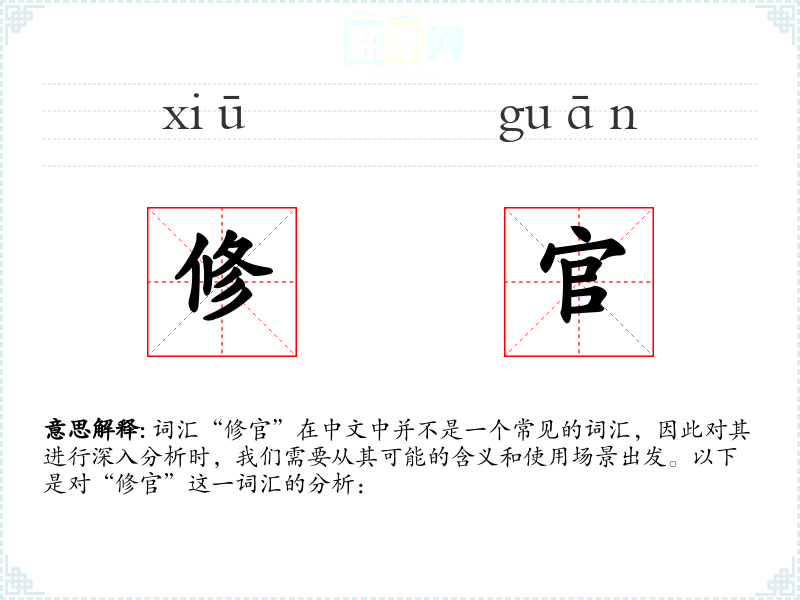 词汇“修官”在中文中并不是一个常见的词汇,因此对其进行深入分析时,我们需要从其可能的含义和使用场景出发。以下是对“修官”这一词汇的分析: