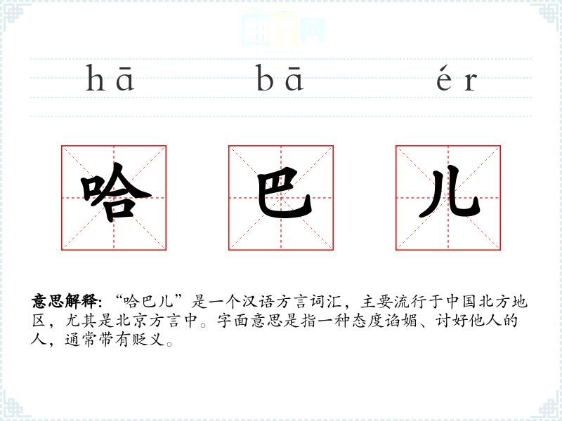 “哈巴儿”是一个汉语方言词汇,主要流行于**北方地区,尤其是北京方言中。字面意思是指一种态度谄媚、讨好他人的人,通常带有贬义。