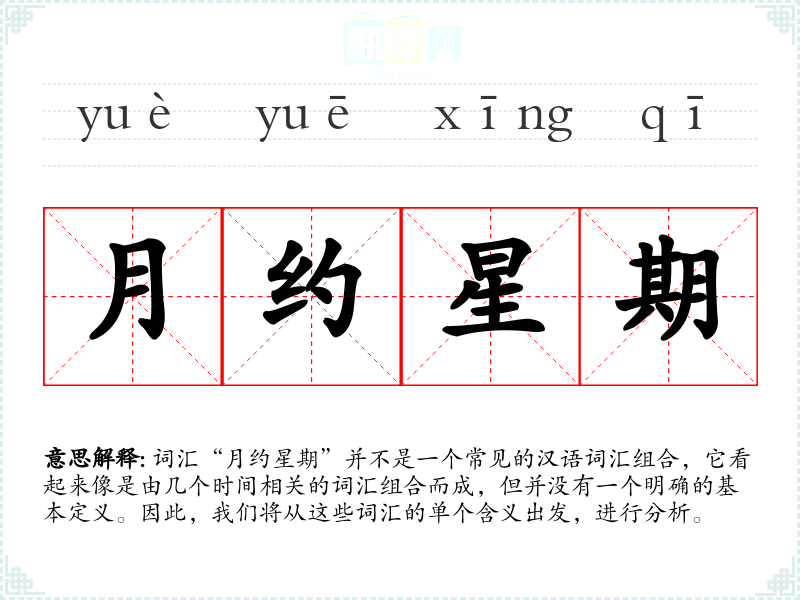 词汇“月约星期”并不是一个常见的汉语词汇组合,它看起来像是由几个时间相关的词汇组合而成,但并没有一个明确的基本定义。因此,我们将从这些词汇的单个含义出发,进行分析。