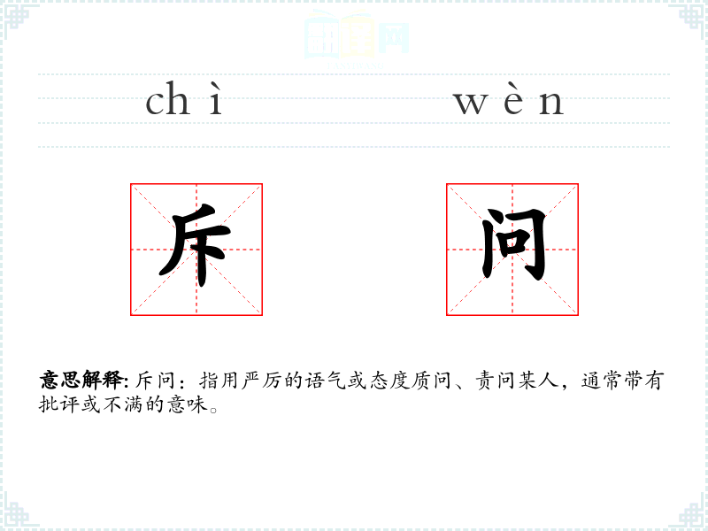 - 词源:斥问由“斥”和“问”两个字组成,“斥”意为排斥、拒绝,“问”意为提问。
