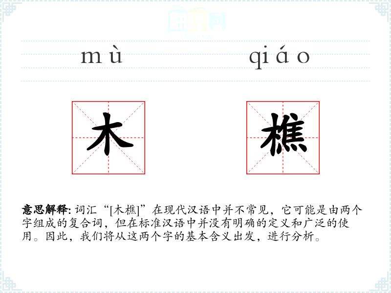 词汇“[木樵]”在现代汉语中并不常见,它可能是由两个字组成的复合词,但在标准汉语中并没有明确的定义和广泛的使用。因此,我们将从这两个字的基本含义出发,进行分析。