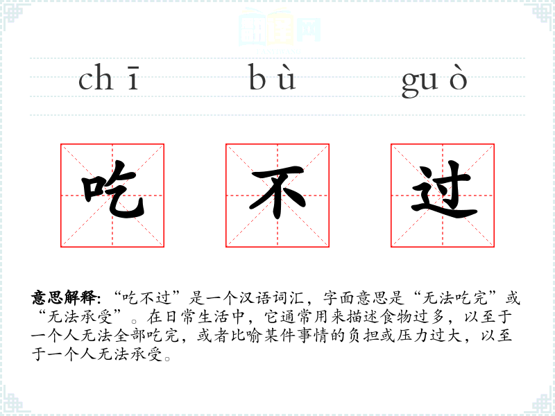 “吃不过”是一个汉语词汇,字面意思是“无法吃完”或“无法承受”。在日常生活中,它通常用来描述食物过多,以至于一个人无法全部吃完,或者比喻某件事情的负担或压力过大,以至于一个人无法承受。