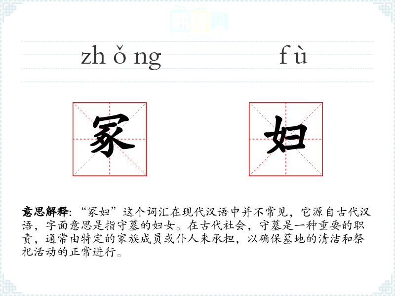 “冢”字在古代汉语中指坟墓,“妇”字指妇女。这个词汇反映了古代社会对墓地管理和祭祀活动的重视。随着社会的发展,这一职业逐渐消失,词汇的使用也逐渐减少。