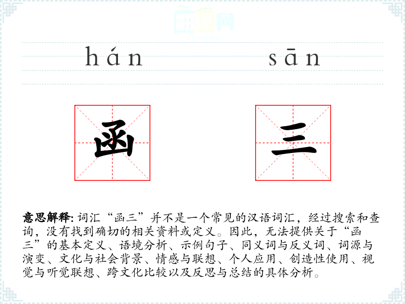 如果“函三”是一个特定领域的术语、方言词汇、网络新词或者是某个特定文献中的用语,可能需要更具体的信息或上下文来提供准确的分析。在这种情况下,建议提供更多的背景信息或者检查是否有拼写错误,以便进行更准确的分析。