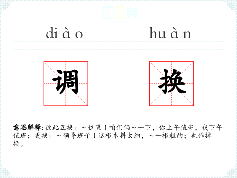 彼此互换:~位置丨咱们俩~一下,你上午值班,我下午值班;更换:~领导班子丨这根木料太细,~一根粗的;也作掉换。