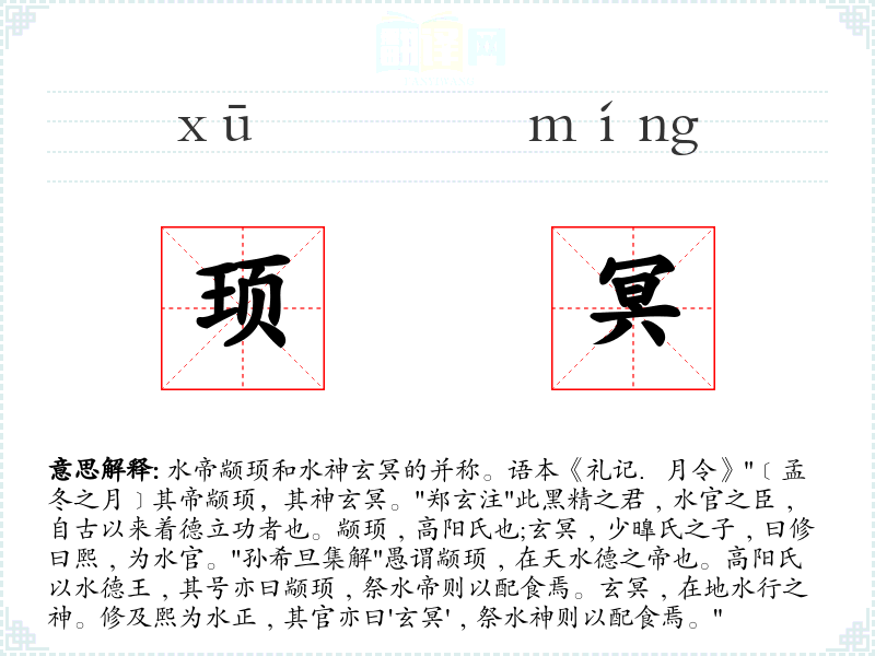 1.水帝颛顼和水神玄冥的并称。语本《礼记.月令》"﹝孟冬之月﹞其帝颛顼,其神玄冥。"郑玄注"此黑精之君﹐水官之臣﹐自古以来着德立功者也。颛顼﹐高阳氏也;玄冥﹐少曍氏之子﹐曰修曰熙﹐为水官。"孙希旦集解"愚谓颛顼﹐在天水德之帝也。高阳氏以水德王﹐其号亦曰颛顼﹐祭水帝则以配食焉。玄冥﹐在地水行之神。修及熙为水正﹐其官亦曰'玄冥'﹐祭水神则以配食焉。"
