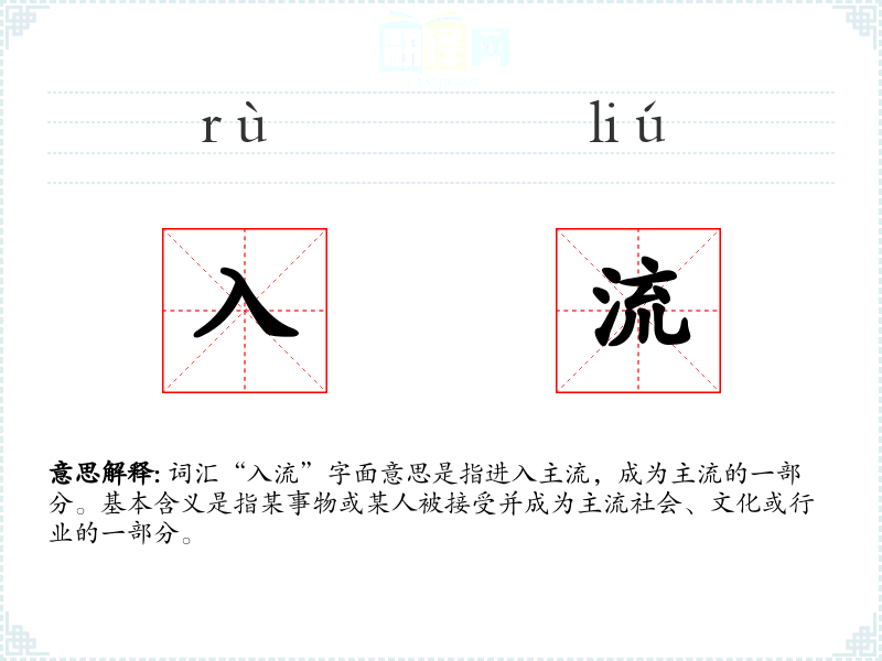 词汇“入流”字面意思是指进入主流,成为主流的一部分。基本含义是指某事物或某人被接受并成为主流社会、文化或行业的一部分。