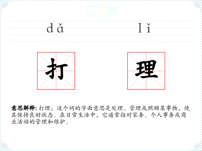 打理:这个词的字面意思是处理、管理或照顾某事物,使其保持良好状态。在日常生活中,它通常指对家务、个人事务或商业活动的管理和维护。