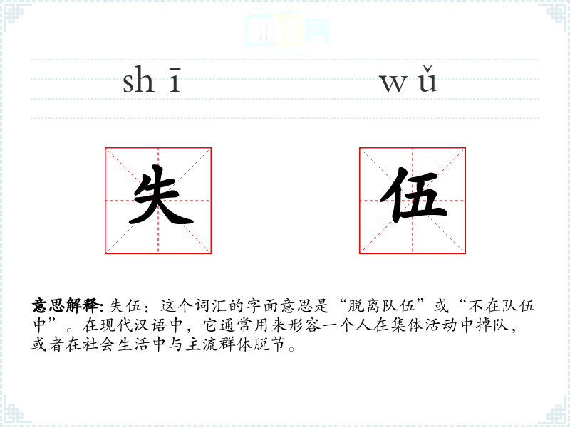 失伍:这个词汇的字面意思是“脱离队伍”或“不在队伍中”。在现代汉语中,它通常用来形容一个人在集体活动中掉队,或者在社会生活中与主流群体脱节。