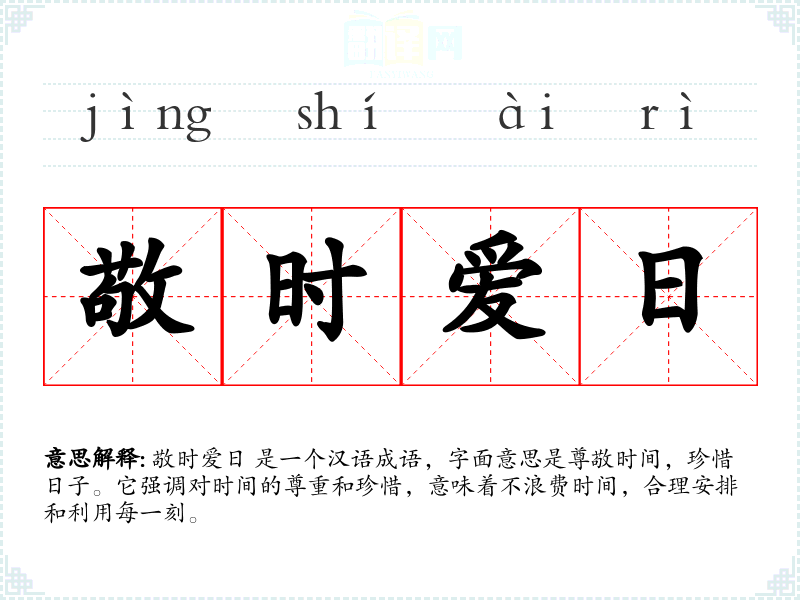 敬时爱日 是一个汉语成语,字面意思是尊敬时间,珍惜日子。它强调对时间的尊重和珍惜,意味着不浪费时间,合理安排和利用每一刻。