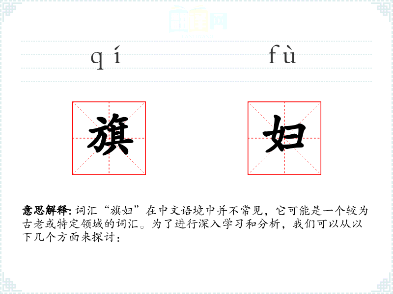 词汇“旗妇”在中文语境中并不常见,它可能是一个较为古老或特定领域的词汇。为了进行深入学*和分析,我们可以从以下几个方面来探讨: