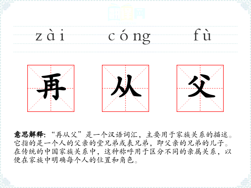 “再从父”是一个汉语词汇,主要用于家族关系的描述。它指的是一个人的父亲的堂兄弟或表兄弟,即父亲的兄弟的儿子。在传统的**家族关系中,这种称呼用于区分不同的亲属关系,以便在家族中明确每个人的位置和角色。