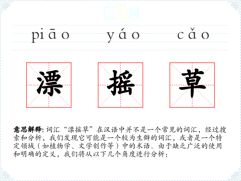 由于“漂摇草”不是一个标准词汇,我们无法提供一个确切的字面意思和基本含义。它可能是指一种植物,其特点是叶子或茎在风中摇曳,或者是文学作品中创造的一个形象,用以形容某种状态或情感。