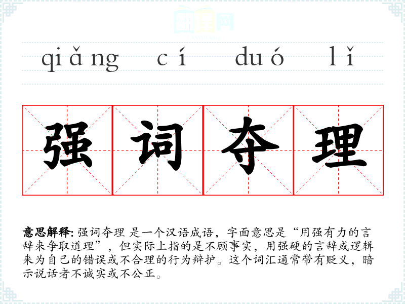 强词夺理 是一个汉语成语,字面意思是“用强有力的言辞来争取道理”,但实际上指的是不顾事实,用强硬的言辞或逻辑来为自己的错误或不合理的行为辩护。这个词汇通常带有贬义,暗示说话者不诚实或不公正。