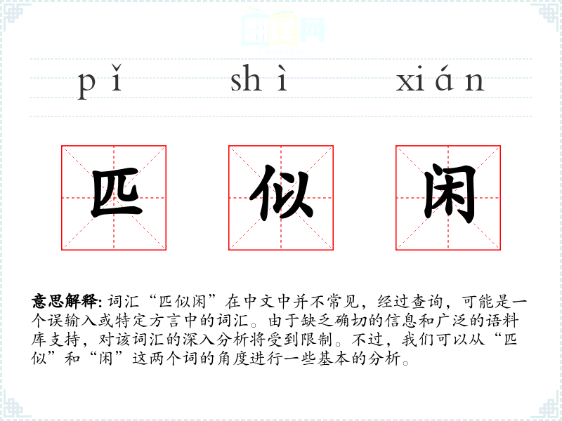 由于“匹似闲”不是一个标准汉语词汇,对其的分析主要集中在“闲”这个词上。在语言学*和表达中,了解词汇的正确用法和语境是非常重要的。对于不常见的词汇,应谨慎使用,避免误解。