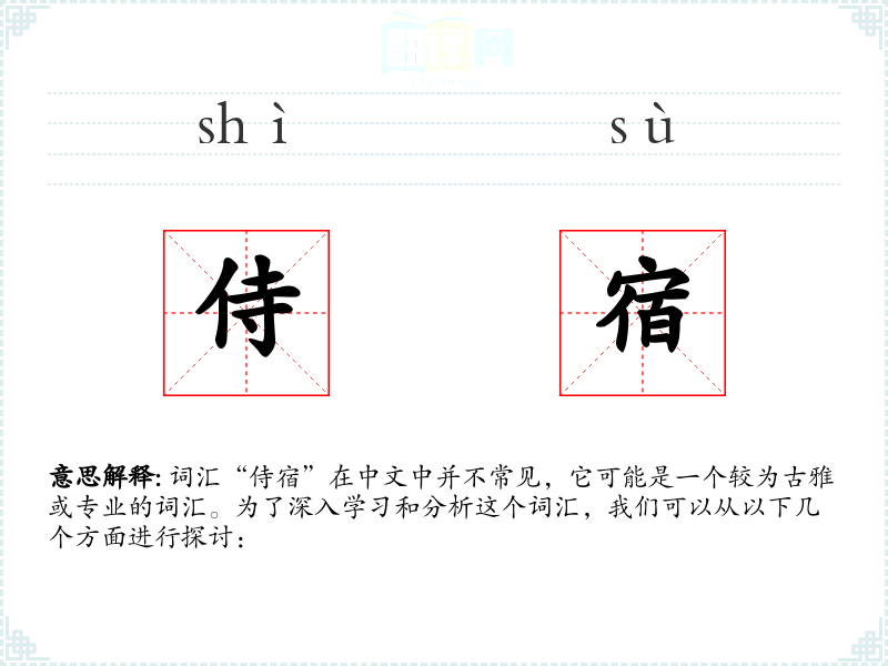 词汇“侍宿”在中文中并不常见,它可能是一个较为古雅或专业的词汇。为了深入学*和分析这个词汇,我们可以从以下几个方面进行探讨: