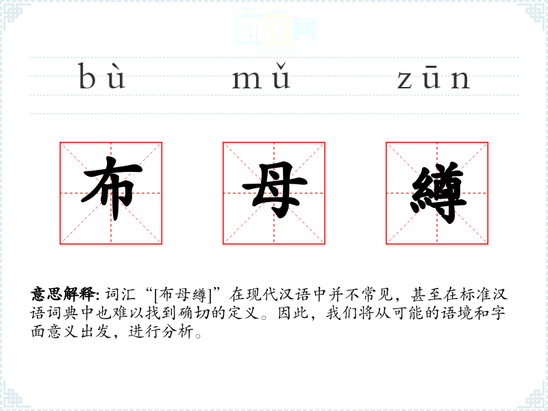 由于“[布母繜]”不是一个标准的现代汉语词汇,我们无法给出确切的字面意思和基本含义。不过,从字面上看,“布”可能指的是布料,“母”可能与母亲或女性有关,“繜”是一个较为生僻的字,现代汉语中几乎不使用,可能与纺织或某种特定的布料有关。