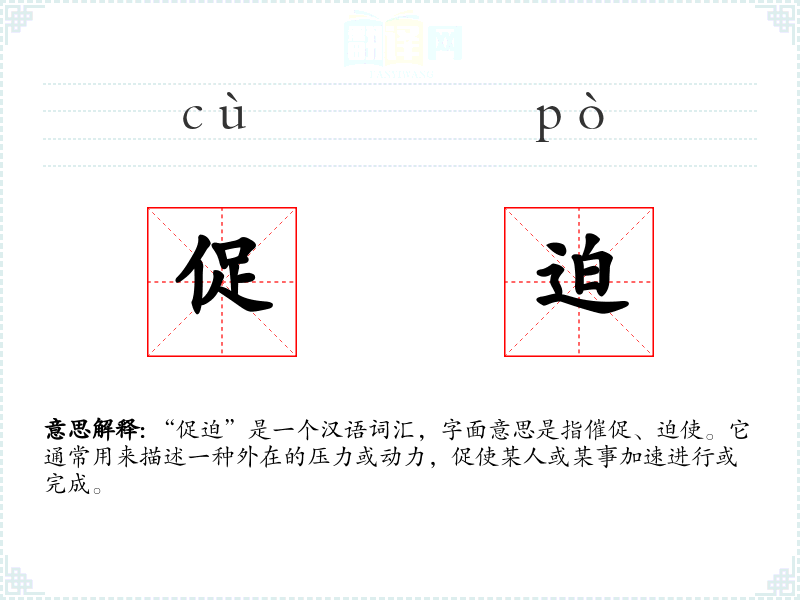 “促迫”一词在古代汉语中已有使用,其词源可能与“促”字的快速、急促之意和“迫”字的逼近、压迫之意相结合。随着时间的推移,这个词的含义和用法在现代汉语中得到了进一步的丰富和细化。