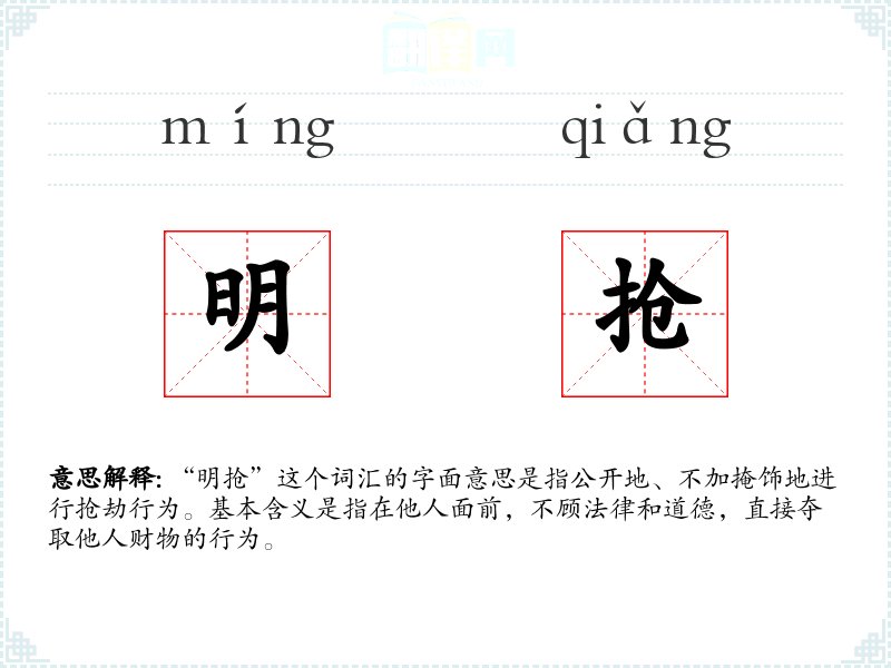 “明抢”这个词汇的字面意思是指公开地、不加掩饰地进行抢劫行为。基本含义是指在他人面前,不顾法律和道德,直接夺取他人财物的行为。