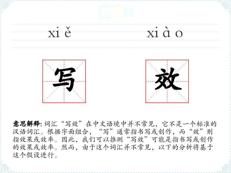词汇“写效”在中文语境中并不常见,它不是一个标准的汉语词汇。根据字面组合,“写”通常指书写或创作,而“效”则指效果或效率。因此,我们可以推测“写效”可能是指书写或创作的效果或效率。然而,由于这个词汇并不常见,以下的分析将基于这个假设进行。